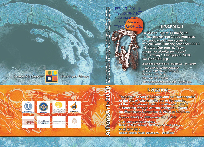 - Athens art international exibition | a cura di Centro d'Arte 4 Stagioni, Tecnopolis, Atene GR. Con il patrocinio di: Comune di Atene, Assessorato alla Cultura, Ministero della Cultura e del Turismo, Tecnopolis | 2010 | catalogo